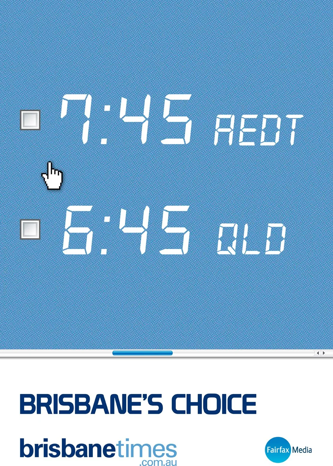 The second campaign was telling Brisbane they have a choice, a voice, and can vote, interact with the stories within the site. Have a live opinion. (Plus me attempting to persuade Queenslanders to embrace daylight savings.)